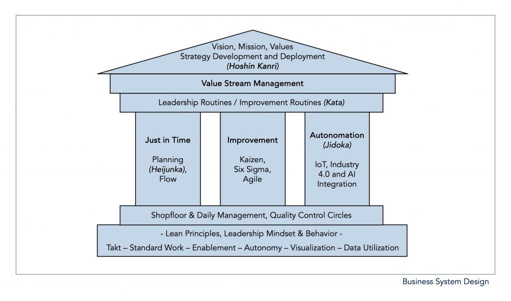 We align the company, corporate culture and behavior with the principles and methods of Lean Management or Just-In-Time, Lean Six Sigma and agility. The resulting business system is not purely operational or production-oriented, but applies to the entire company and all business functions. We integrate the various system components with one another: